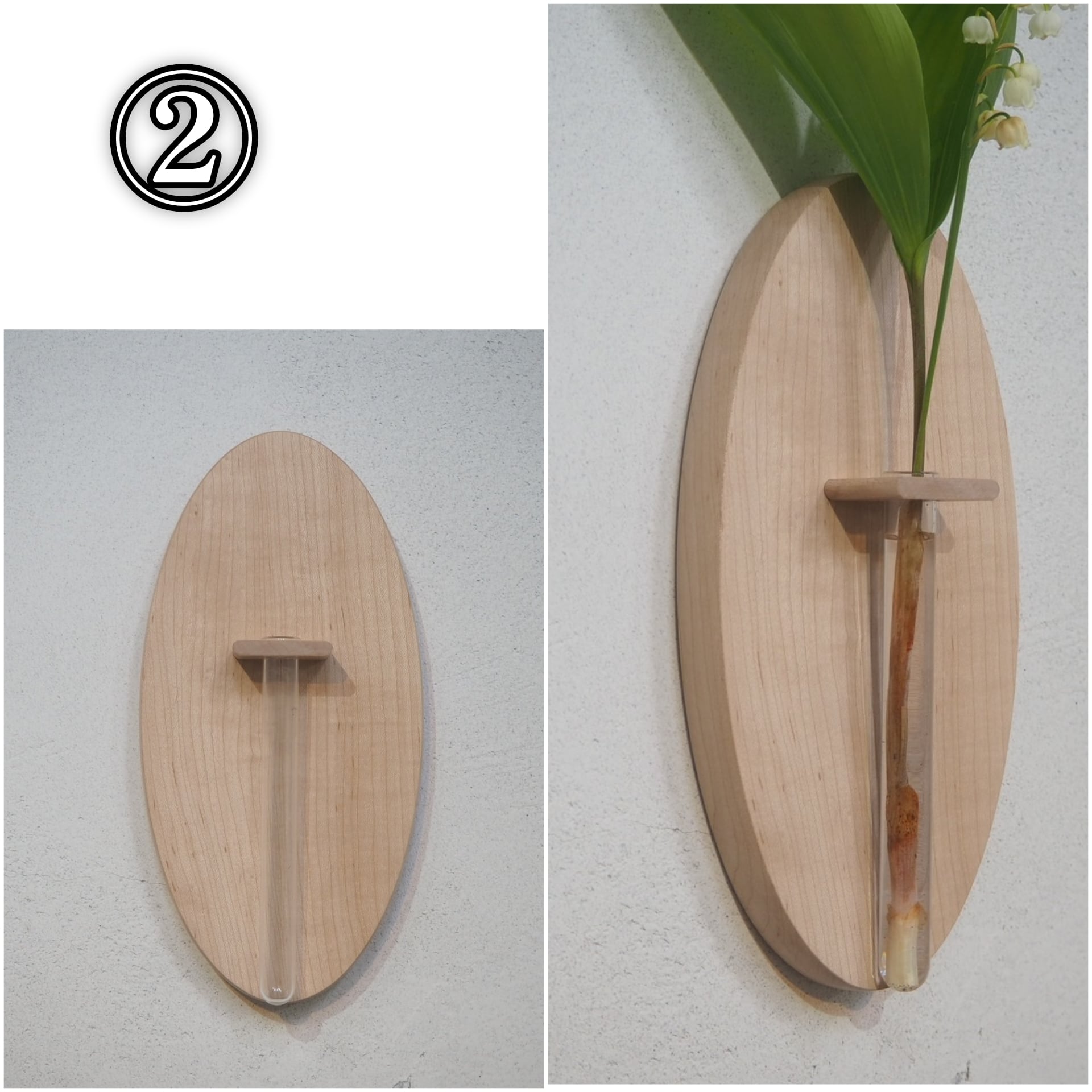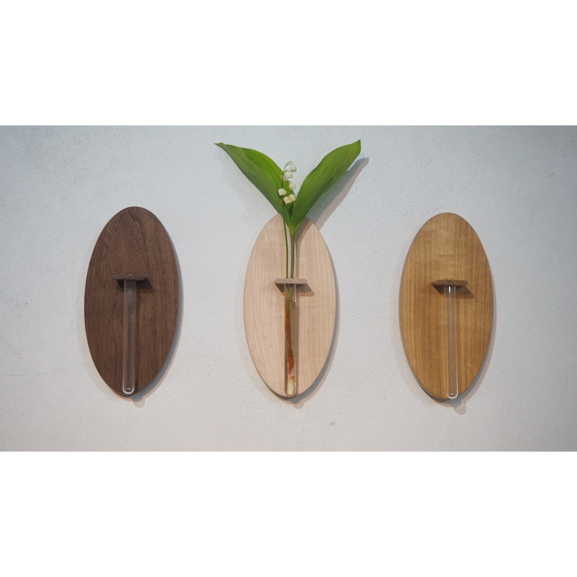シンプルな形と木目で綺麗な花を引き立てる一輪挿しです。壁掛けなので空間のアクセントにもなります。画鋲やビスに引っ掛けるだけで簡単に固定ができます。